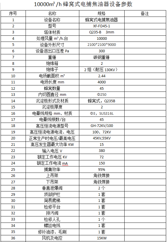 5000风量、10000风量、20000风量、30000风量、50000风量蜂窝式电捕焦油器,其风量是指单位时间内空气的流通量,风量单位用m3/min、m3/h表示,又称烟气量;电捕焦油器的处理风量是选型的关键,确定了处理风量,就可以确定电捕焦油器的型号了。处理风量的大小对设备的工作有很大影响,选大选小都会降低除烟效率。慧阳环保建议大家在选用电捕焦油器型号之前,咨询专 业的生产厂家,让技术人员为您设计。如果您有什么不懂或是疑问请拨打13333079818穆经理。