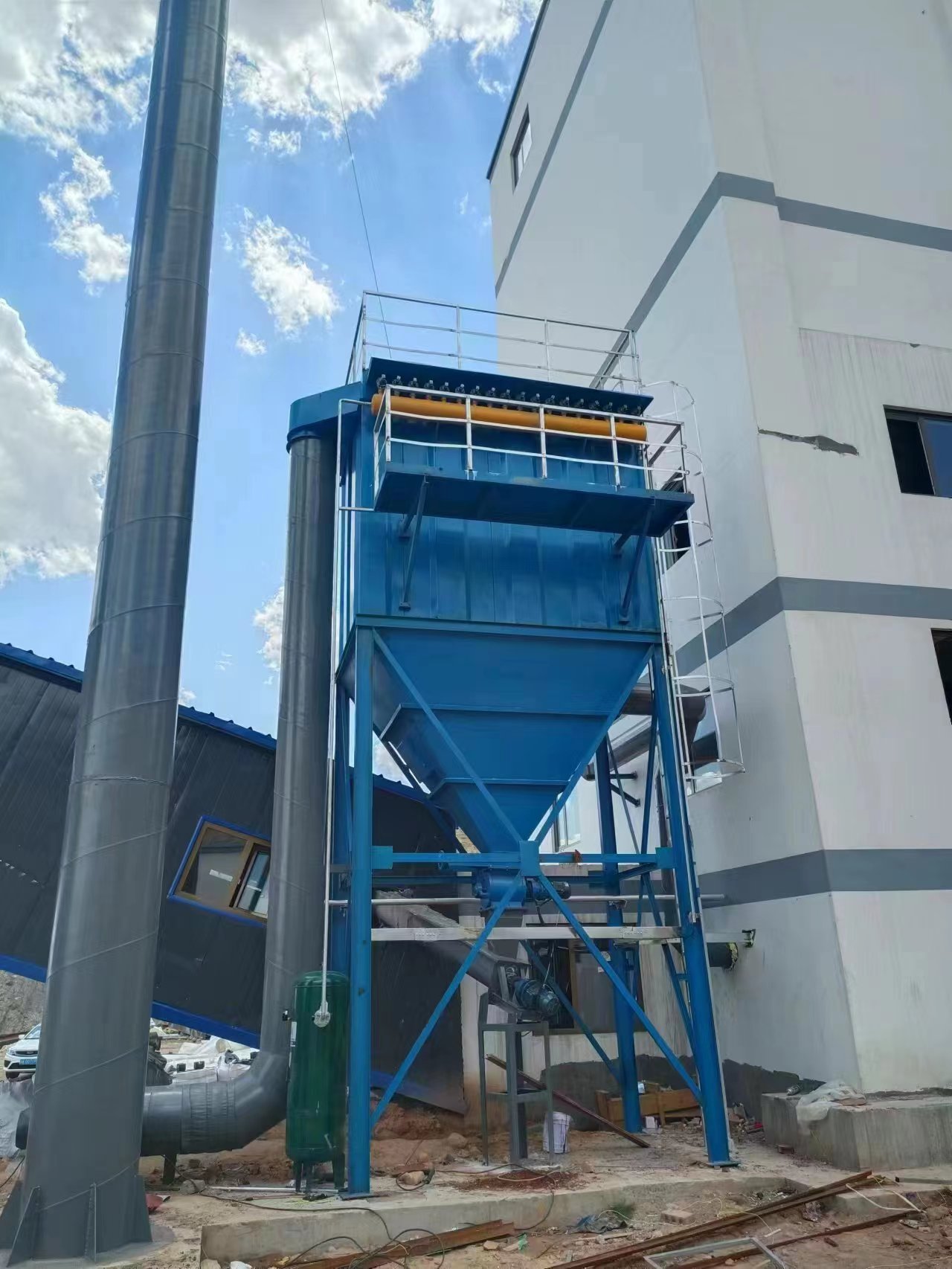 在风机的作用下,含尘气体由风管进入蜗壳式旋风筒内,粉尘在离心力作用下沿壳体内壁运行,粗粒粉尘被分离进入灰斗,微细粉尘随气体穿过滤袋成清洁气体,由风机排入大气,而细粉被滤袋挡在外表面积成尘饼而下落,达到除尘净化的目的。